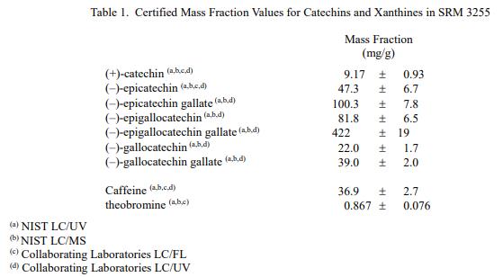 表 1 和表 2 提供了 SRM 3255 中兒茶素、黃嘌.呤和元素的認(rèn)證質(zhì)量分?jǐn)?shù)值,以干質(zhì)量為基礎(chǔ)報(bào)告。NIST 認(rèn)證值是 NIST 具有最高置信度的值在其準(zhǔn)確性方面,所有已知或可疑的偏差來源都已被調(diào)查或考慮 [1]。價(jià)值分配分析由 NIST 和合作實(shí)驗(yàn)室進(jìn)行。兒茶素和黃嘌.呤的認(rèn)證值是各組結(jié)果的同等加權(quán)平均值;元素的認(rèn)證值計(jì)算為 NIST 方法的平均值的平均值和合作實(shí)驗(yàn)室提供的結(jié)果平均值的中位數(shù)(如果適用)。相關(guān)的不確定性以大約 95% 的置信水平表示 [2-4]。