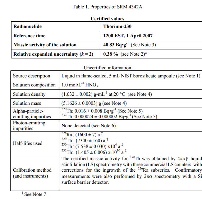 在 2007 年 4 月 1 日美國東部標準時間 1200 的參考時間,經認證的釷 230 質量活度值為:(40.83 ± 0.16) Bq?g-1