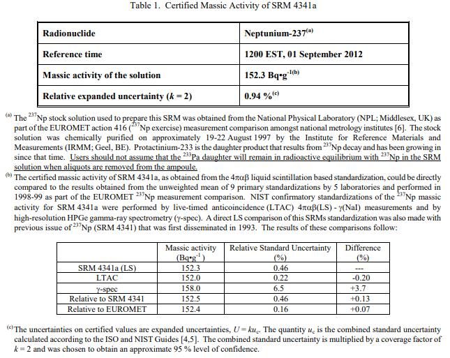 在 2012 年 9 月 1 日美國東部標(biāo)準(zhǔn)時(shí)間 1200 的參考時(shí)間,經(jīng)認(rèn)證的镎 237 質(zhì)量活度值為:(152.3 ± 1.4) Bq?g-1
