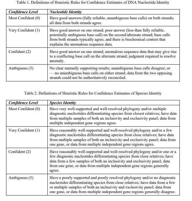 經認證的物種鑒定是銀杏,來自 psbA-trnH 基因間間隔區和 trnL 內含子區域的相關葉綠體 DNA 序列可在伴隨的 FASTA 格式文件中獲得 [1]。與序列中每個核苷酸相關的不確定性,以及與作為物種標識符的 DNA 序列相關的不確定性,以表示對規定值的信念強度的序數尺度表示(0 = 最有信心,1 = 非常有信心,2 = 有信心,3 = 模棱兩可)(表 1 和表 2)[2]。
