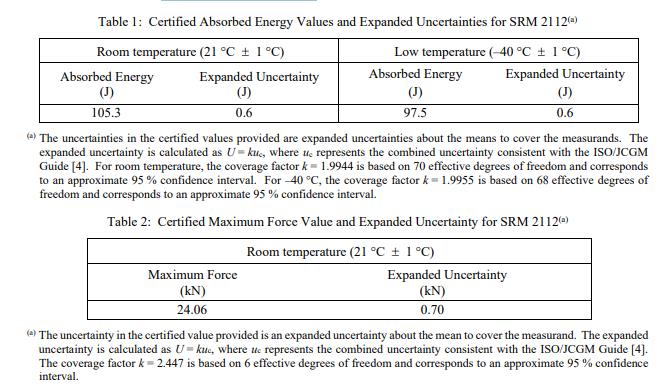 NIST 認證值是 NIST 對其準確性有最高置信度的值,因為所有已知或可疑的偏差來源都已被調查或考慮 [3]。可追溯性是國際單位制 (SI) 焦耳(吸收的能量)和千牛頓(力)單位。為 NIST SRM 2112動態沖擊力驗證樣本(標準品) 樣品確定的認證值在表 1 和表 2 中給出。