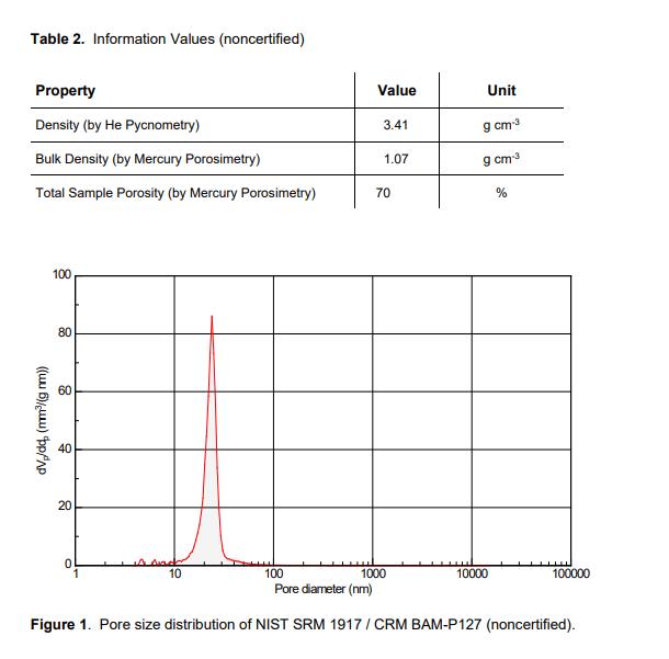 NIST SRM 1917汞滲透測量標準(標準品)由氧化鋁珠組成。材料的初級顆粒形成穩定的附聚物。使用水銀孔隙率測定法,測量團塊內的孔隙。