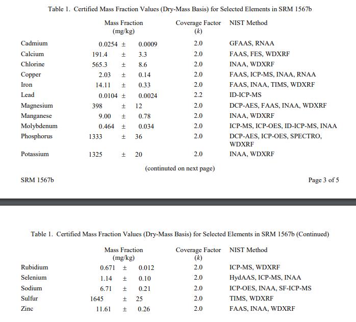 表 1 提供了 SRM 1567b 中選定元素的認證質量分數值。 NIST 認證值是 NIST 對其準確性的最高置信度的值,因為所有已知或可疑的偏差來源都已調查或考慮[1]。以質量分數單位 [2] 以干質量為基礎報告值。